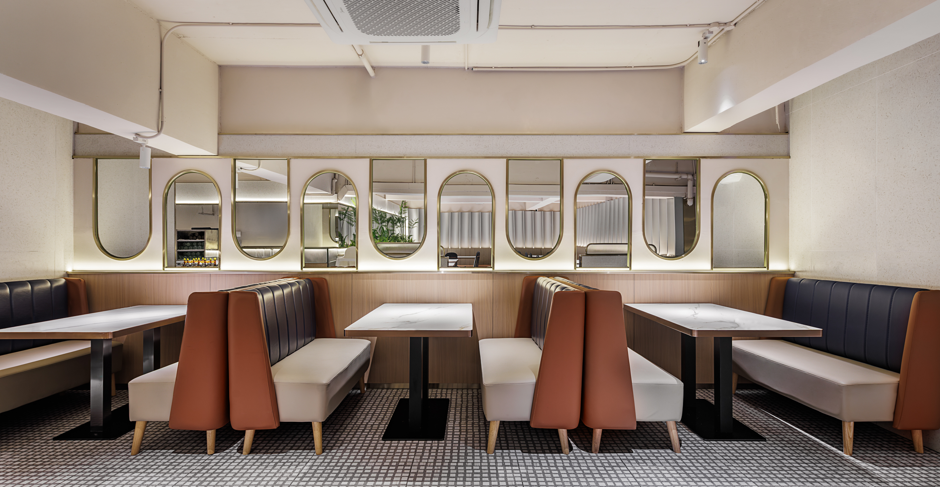墙体的弧形兼具吸音与装饰功能, 镜面的弧形放映错位时空掠影, 灯饰的半圆是logo图样最小单位的注解, 天花的弧形与中空呼应延展层次…… 整体餐区空间的设计犹如一个时空漂流瓶, 人们欢聚的场景则是一封跨时空的港风情书。