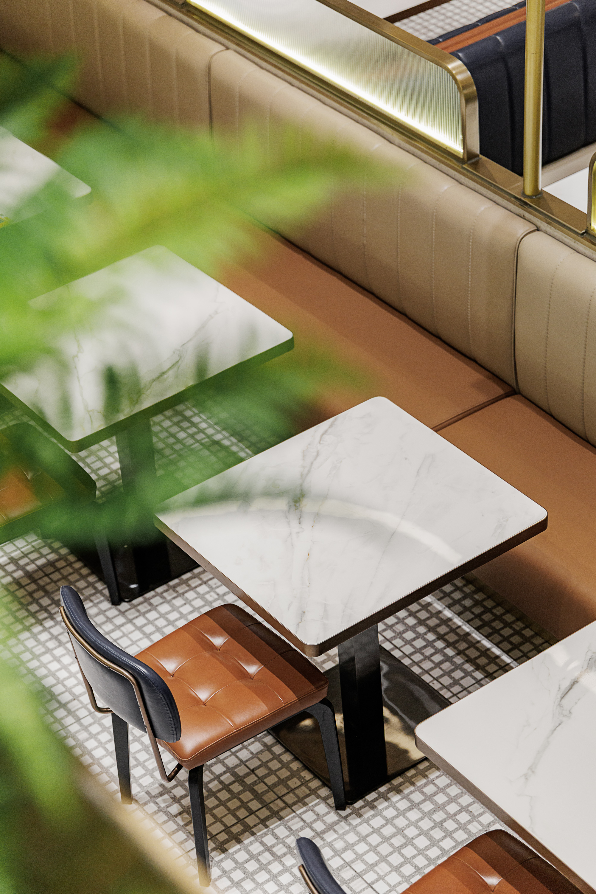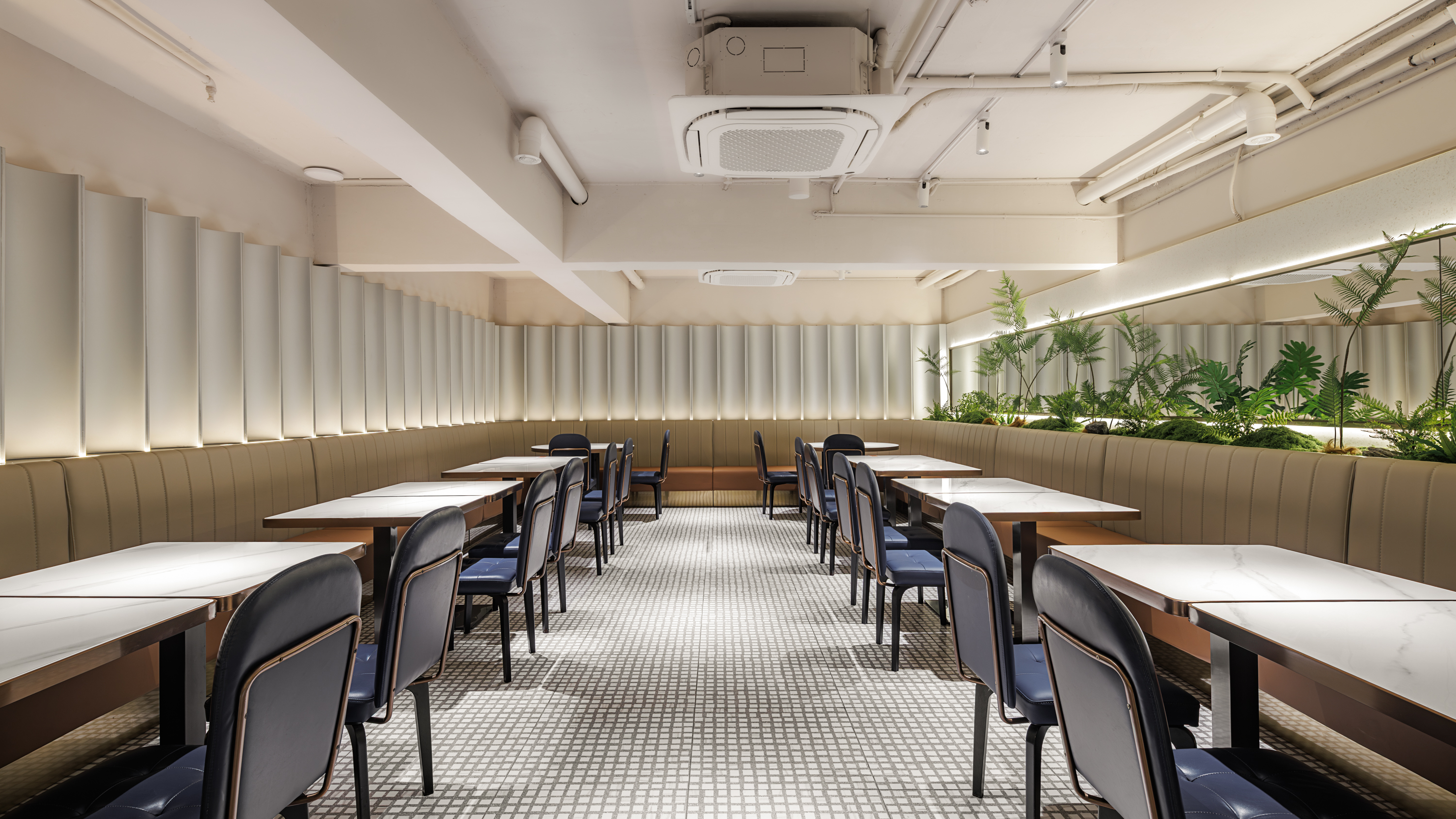 自步梯上二层中空又见一番风景, 更简约也更精致,内敛的艺术漆 涂抹的纯粹空间被镜像放大2倍, 绿植掩映之下,盎然生机斜逸而出, 食饮之趣不经意间再添小惊喜。